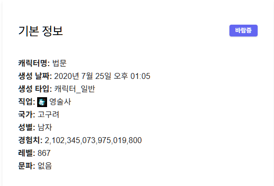 바람의나라 캐릭터 정보 조회 캐릭터명: 서버: 연 무휼 유리 진 하자 호동 ..